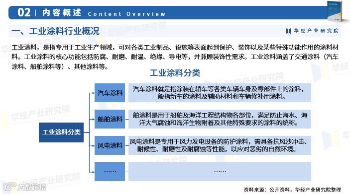 工业涂料是指应用于工业生产领域,对各类工业制品及设施表面起保护、装饰和特殊功能作用的材料。其核心功能包括防腐、耐磨、耐温、绝缘、导电等,并兼顾美观需求,广泛应用于汽车、船舶、航空、风电、轨道交通等领域。