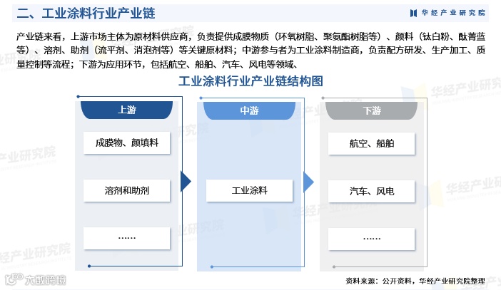 工业涂料产业链分为上游原材料供应、中游制造和下游应用三大环节。上游主要包括成膜物质(如环氧树脂、聚氨酯树脂)、颜料(如钛白粉、酞菁蓝)、溶剂及助剂(如流平剂、消泡剂)等;中游为涂料生产企业,负责配方研发、生产加工与质量控制;下游涵盖汽车、船舶、航空、风电等多个工业领域。