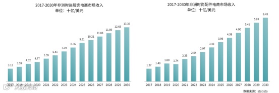 2017年非洲时尚服饰在线市场收入为31.2亿美元,预计2025年达95.1亿美元,2030年将攀升至133.5亿美元。同期,时尚配件市场收入从12.7亿美元增至39.6亿美元,预计2030年达64.3亿美元。