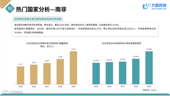 电商用户方面,2025年南非电商用户约1167万,渗透率为22.27%;预计2029年增至2152万,渗透率提升至34.26%,市场潜力持续释放。