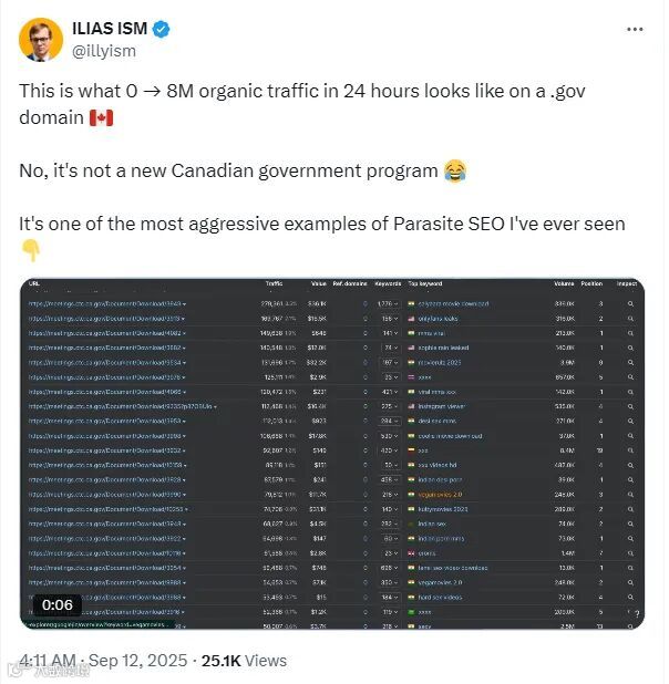 近期,大量本应高度可信的政府(.gov)和教育(.edu)网站正遭受大规模“寄生式SEO”攻击。黑客利用系统漏洞,在高权重网站上植入非法内容页面,使其迅速获得谷歌高排名,为色情、AI脱衣等黑产关键词引流,部分网站自然流量在24小时内暴增数百万次,引发SEO行业广泛关注。