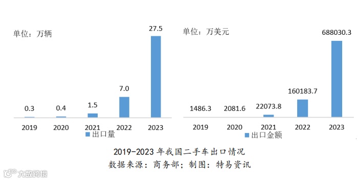 我国二手车出口持续增长,规模再创新高。2023年,全国二手车出口量达274,534辆,出口金额68.8亿美元,同比分别增长294.2%和329.5%。这一增长得益于中国汽车制造技术的提升、产品质量优化以及国内车辆更新换代频率加快,推动了二手车国际市场竞争力增强。