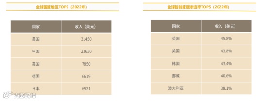 美国在全球智能家居市场中占据领先地位,市场份额达45.8%,其次为中国、英国、德国和日本。英国是全球智能家居渗透率最高的国家,北美及部分欧洲地区整体渗透率处于较高水平。