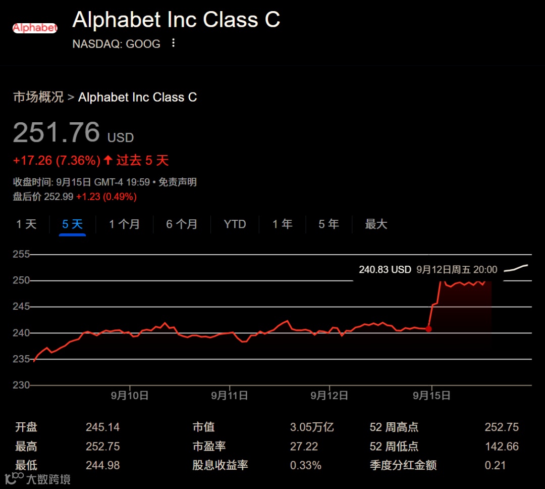 今年以来,Alphabet股价累计涨幅达32%,远超大盘12.5%的表现。推动此次市值跃升的关键因素包括:反垄断诉讼尘埃落定、AI技术落地加速以及多业务线协同发展带来的增长确定性提升。