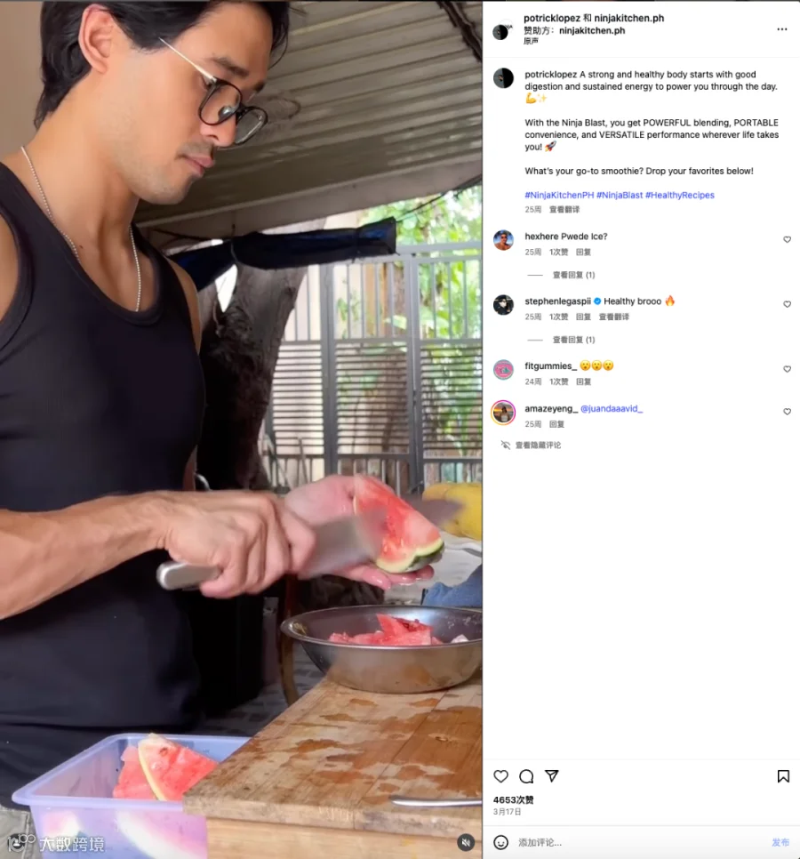 例如本地美食博主Patrick Apollo,粉丝不足9万,但互动率高,内容场景贴近普通家庭——其厨房为典型的菲律宾钢瓦平房,增强了本土消费者的认同感。他发布的Ninja Blast水果奶昔制作视频,最终收获百万播放与4653次点赞,传播效果远超预期。