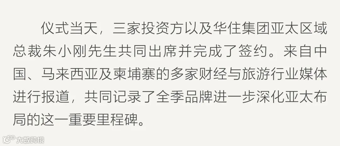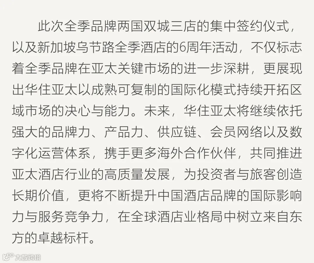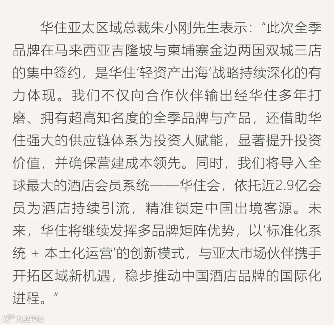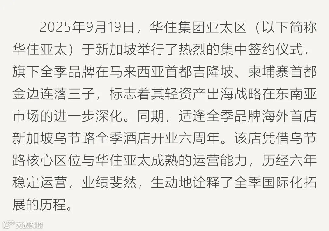 导读:2025 年 9 月 19 日,华住集团亚太区(以下简称华住亚太)于 新加坡 举行了 热烈 的 集中 签约仪式,旗下全季品牌在马来西亚 首都 吉隆坡、柬埔寨 首都 金边连落三子 , 标志着其轻资产出海战略在东南亚市场的进一步深化。