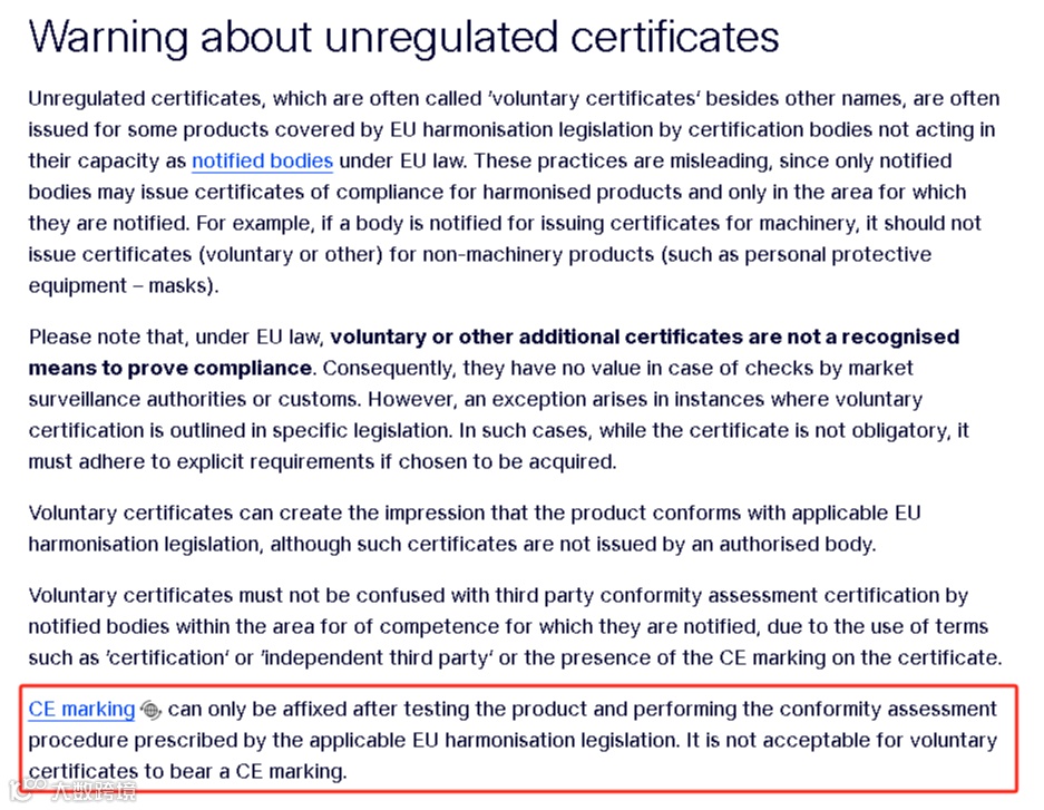 早在2022年6月29日,欧盟发布《The ‘Blue Guide’ on the implementation of EU product rules 2022》(委员会通告),对CE标志的使用规则作出明确规定,强调不得在非强制性认证文件中滥用CE相关术语和标识。