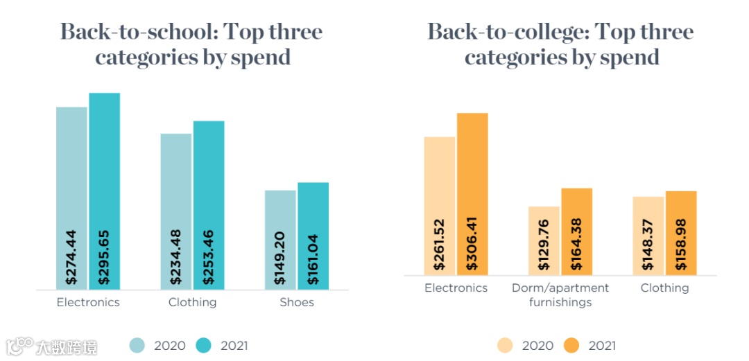 此外,K-12预期开销前三名分别是电子产品、衣服、鞋子,高校学生预期开销前三名分别是电子产品、宿舍/公寓家具陈设、衣服。