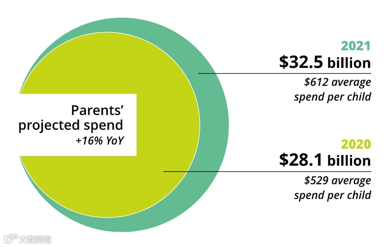 因此,40%的父母预期用于购买开学物品的花销会增加。同比去年,父母预期花销总体增长了16%,从2020年的281亿美元到今年的325亿美元,达到近年来的最高值。