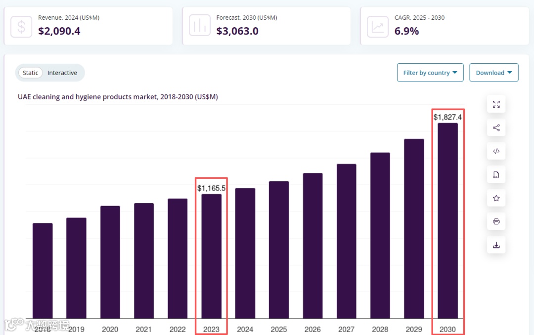 2024年阿联酋清洁与卫生产品市场规模约为20.9亿美元,预计到2030年将增至30.63亿美元,2025–2030年复合年增长率达6.9%。洗涤剂和去油类产品为主力品类,消毒杀菌类与便捷型产品增速最快。