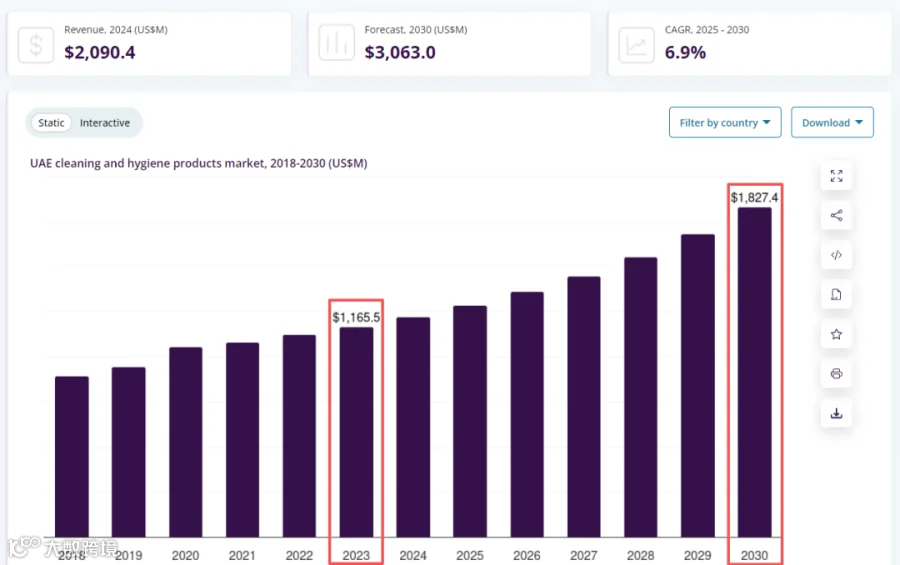 沙特清洁与卫生市场2024年规模达29.3亿美元,预计2025–2030年年均增速约7.6%。政府推动经济适用房建设,叠加酒店、办公、教育等商业机构扩张,持续拉动清洁用品采购需求。