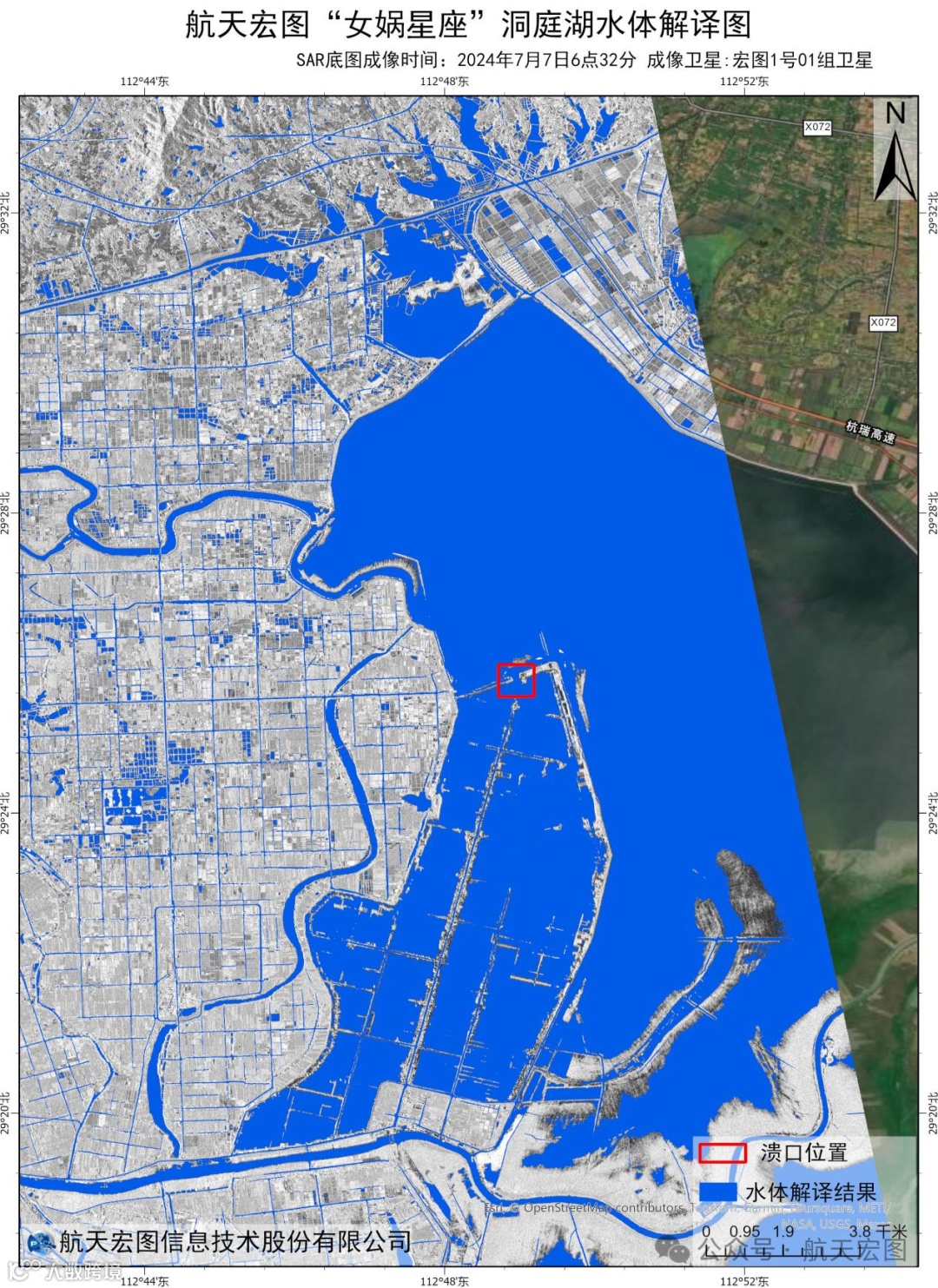 2024年7月,洞庭湖团洲垸因强降雨发生决堤。利用SAR影像与天权模型快速提取水体信息,清晰呈现溃口位置与淹没范围,为抢险救援提供关键数据支持。