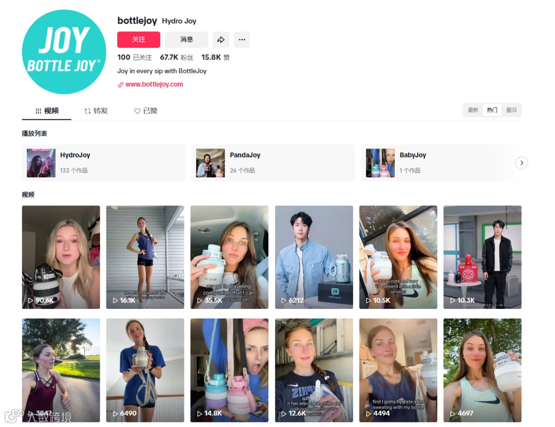 品牌在TikTok等平台积极布局,海外账号多个视频播放量破万,最高接近10万次。用户以Vlog形式分享健身打卡、日常饮水场景,真实展现产品使用体验,增强品牌粘性。