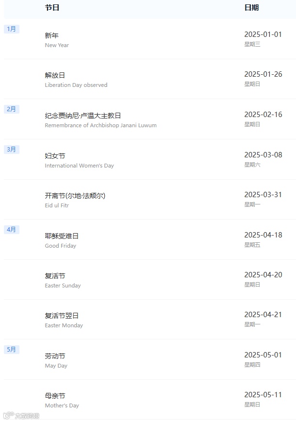 - 官方语言:英语、斯瓦希里语,通用卢干达语等地方语言