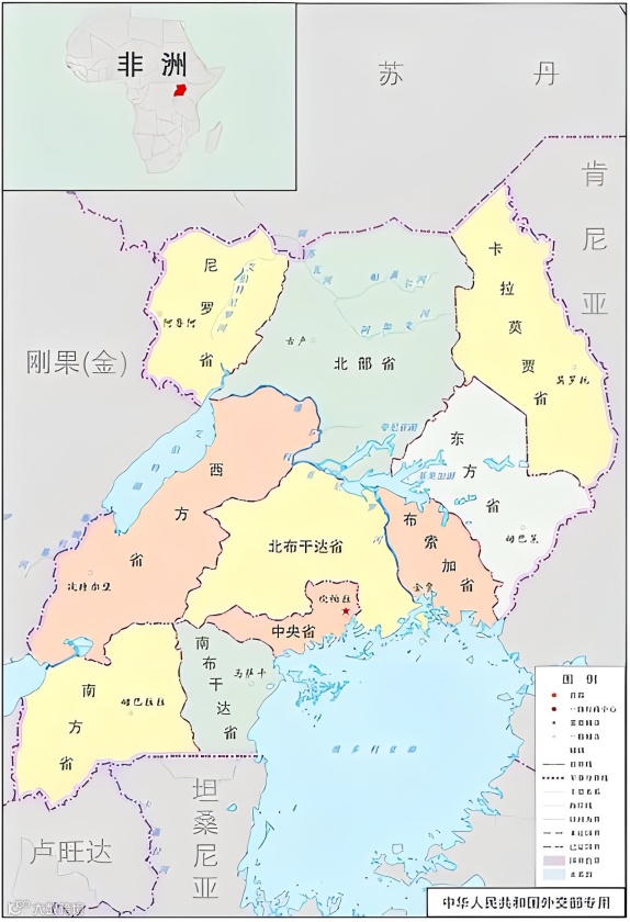 乌干达共和国(The Republic of Uganda),简称“乌干达”,位于非洲东部,为内陆国,地跨赤道。东邻肯尼亚,南接坦桑尼亚和卢旺达,西连刚果民主共和国,北毗南苏丹。属热带草原气候,年均气温约22℃,气候温和、雨量充沛。