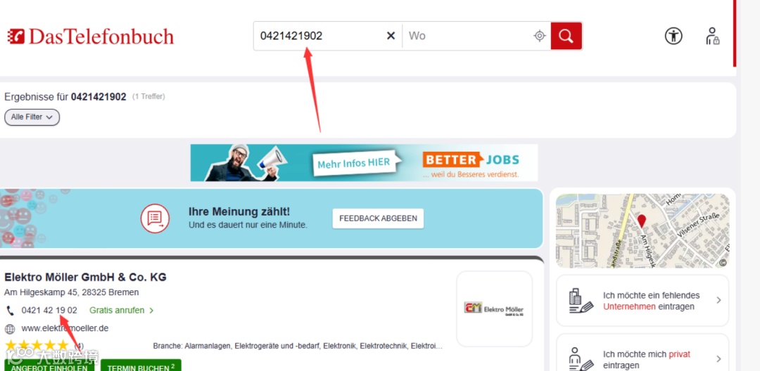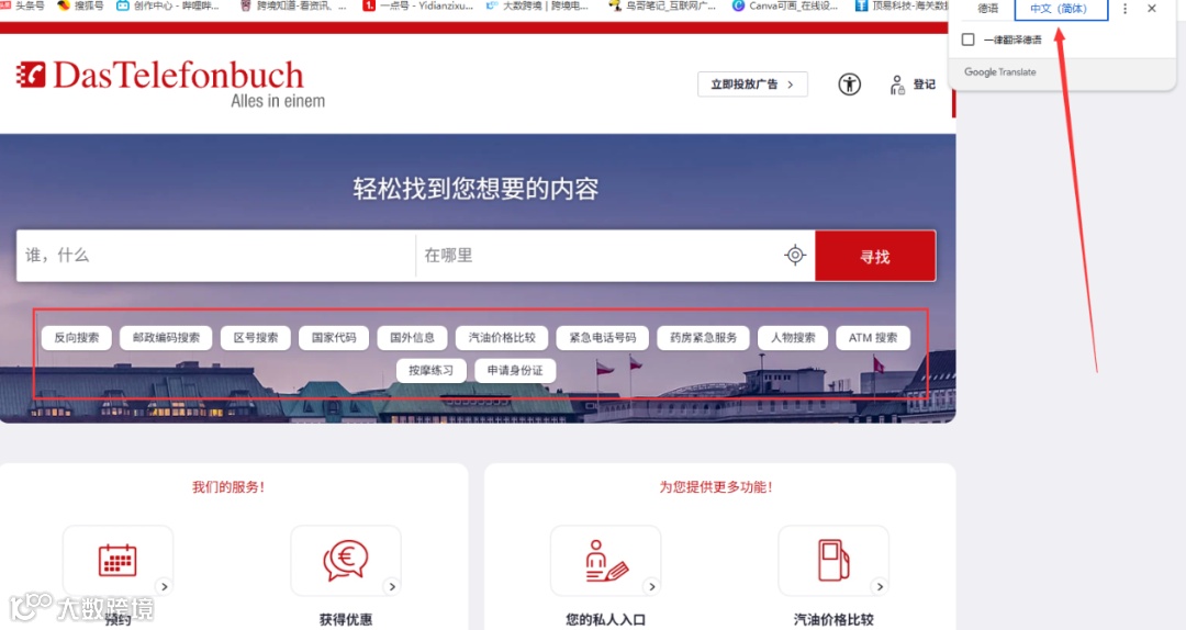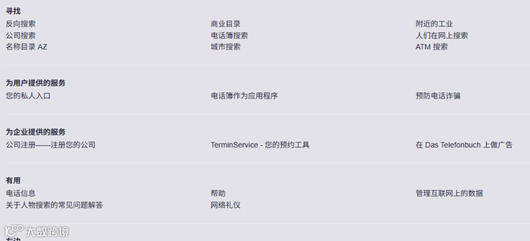 支持企业搜索、人名搜索、定向搜索和地图定位等多种功能。德语不熟练者可借助谷歌翻译浏览中文页面;懂德语者建议直接使用德语搜索以提升准确率。