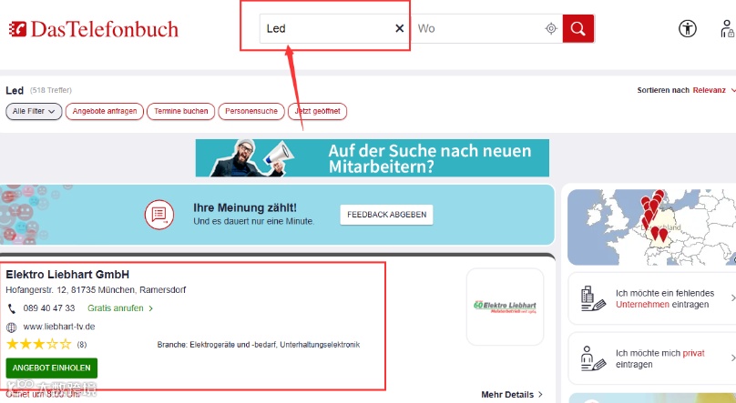 该功能对B2B外贸开发极具价值,支持按行业关键词、公司名称或地址检索目标企业。例如输入“led”,即可获取柏林地区灯具相关企业的完整信息,包括公司名、联系电话、官网、邮箱及经营范围。