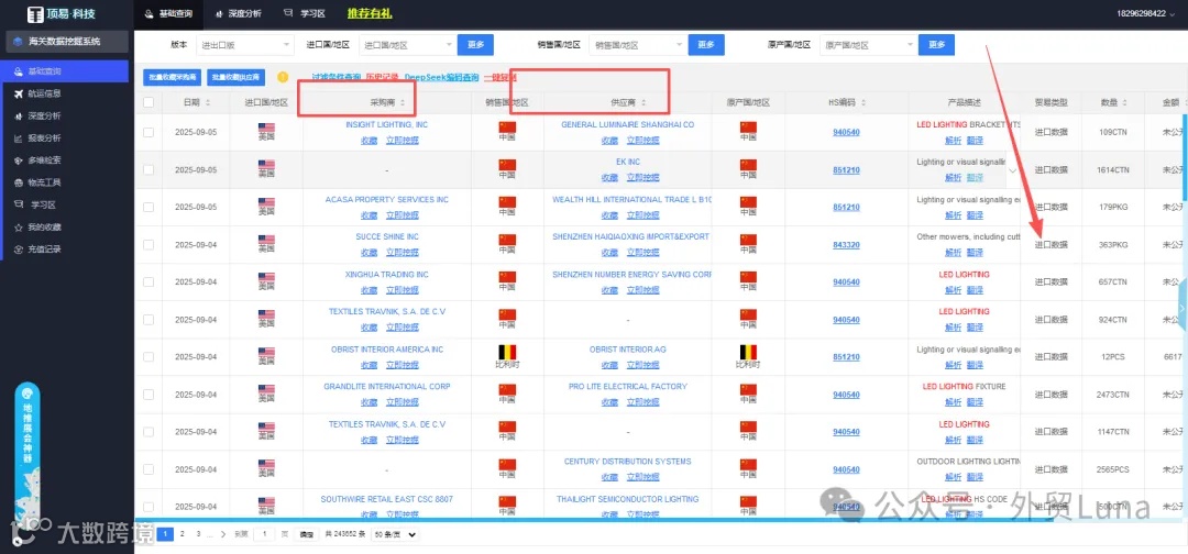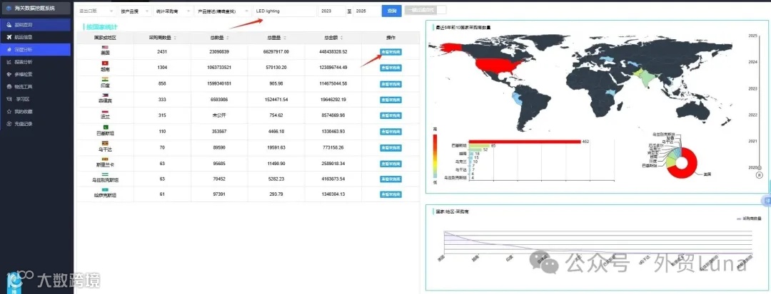可搭配海关数据查询目标公司的进出口情况,了解其合作采购商分布,分析行业趋势并制定精准市场策略。例如,搜索“LED lighting”,即可查看相关采购商公司名称、HS编码、交易数量、金额、重量及详单信息。