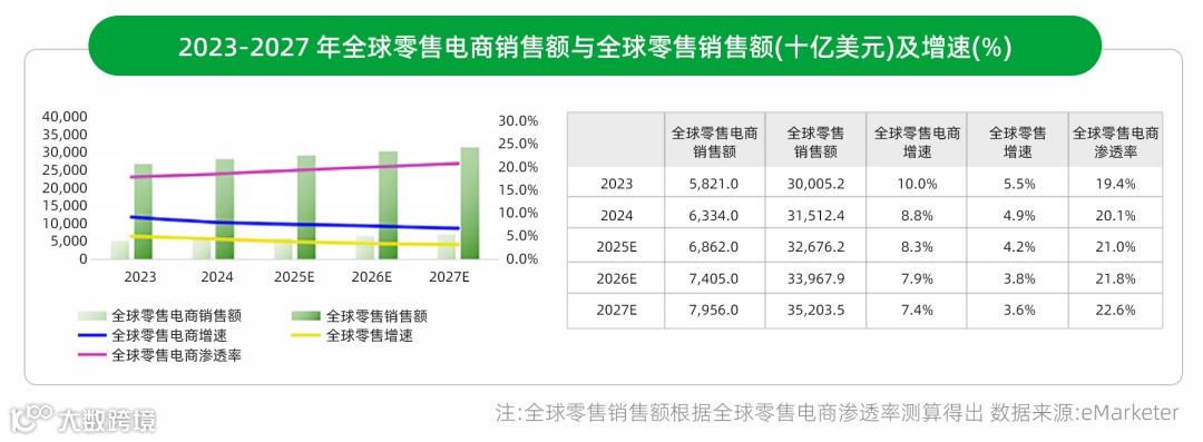 全球电商市场展现出强劲韧性与增长活力。在数字技术迭代升级与消费者行为线上迁移的双重驱动下,电子商务市场持续释放增长势能。据市场研究机构eMarketer数据,2025至2027年全球电商销售额预计将从6.8万亿美元上升至8万亿美元,占全球零售市场比例将由21%提升至22.6%。