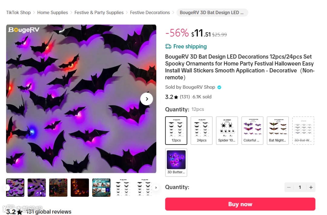 近期在TikTok上爆火的蝙蝠3D墙贴已引发TRO侵权投诉,部分商品被下架,提醒卖家谨慎上架相关产品。尽管如此,万圣节旺季流量巨大,仍有多个合规选品方向值得关注。