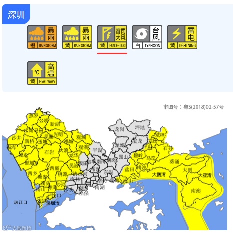 【深圳市分区雷雨大风黄色预警信号】深圳市气象台于2025年09月18日14时40分对南山区、盐田区、宝安区、光明区、龙华区、坪山区、大鹏新区以及大鹏湾、大亚湾发布雷雨大风黄色预警。预计未来1-2小时上述区域将出现雷阵雨,并伴有8级左右短时大风和强雷电。请立即落实防风、防雷电措施,确保人员与设施安全。