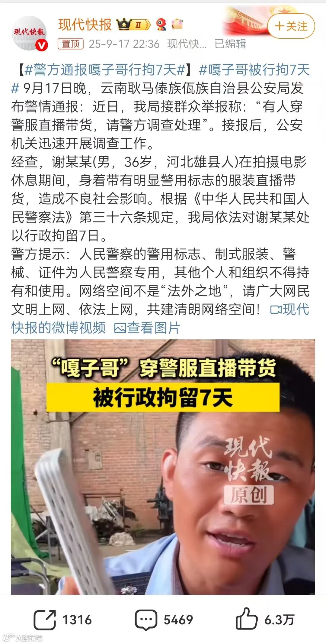 嘎子哥穿警服直播被行拘,快手账号遭封禁