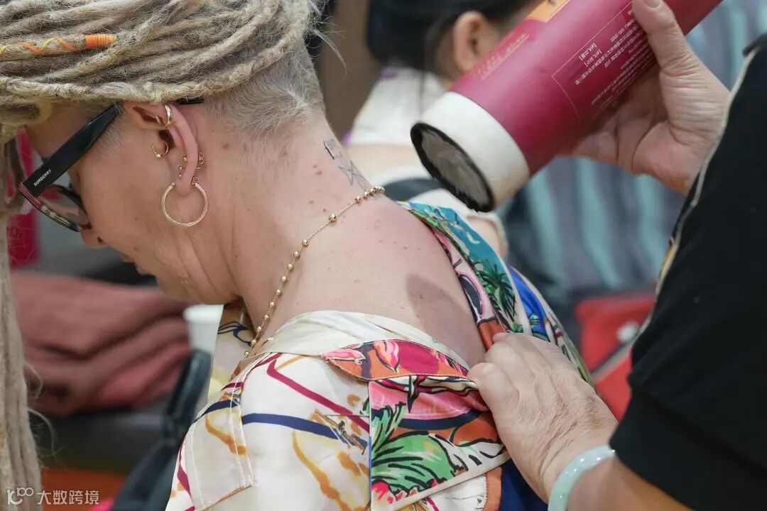 ▲ 2025年9月2日,一名外国人在中国广州国际艾灸产业博览会上体验艾灸。(图片来源:VCG)