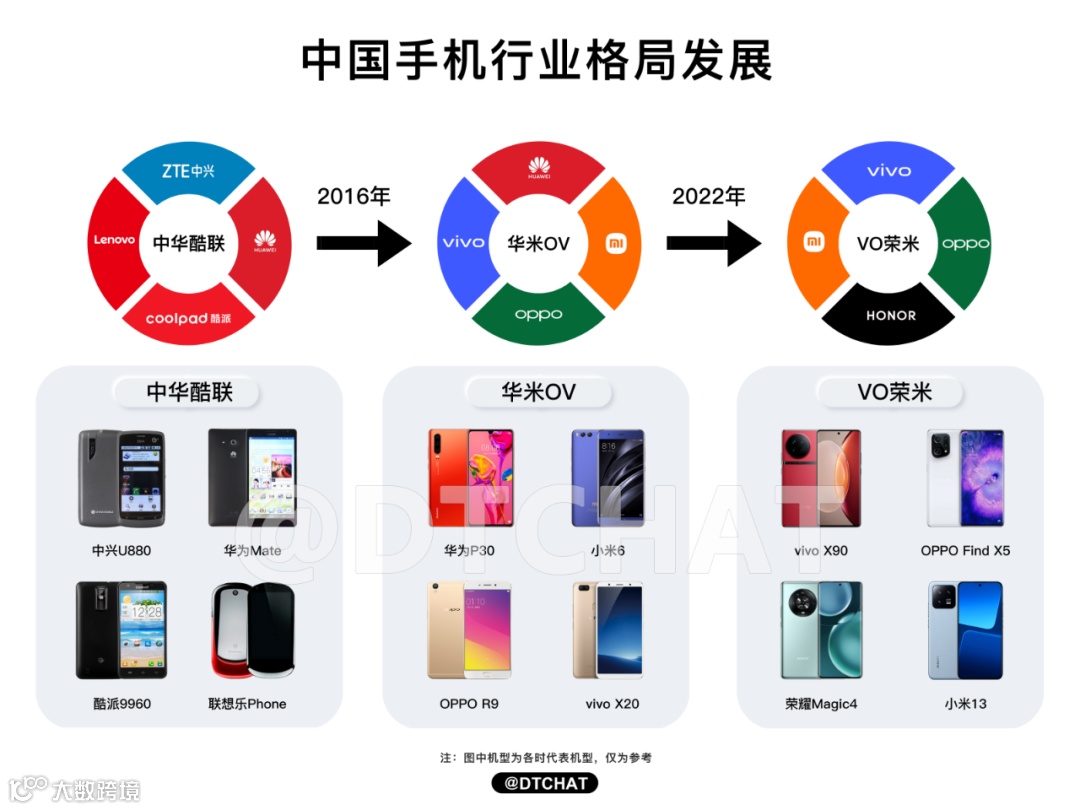 三是,在“VO荣米”格局之下,头部厂商市占率进一步提升,带来全新的增长机会。据Counterpoint数据显示,2022年中国智能手机市场,vivo以19.2%市场份额夺冠,国产手机品牌OPPO(17.5%)、荣耀(16.7%)、小米(13.9%)分列其后。很明显如今的中国手机品牌格局再次迎来了改变,对比前两年的数据不难发现,以“VO荣米”为代表的头部厂商占据的市场份额更集中了,这其中自然包括其他厂商退出带来的市场空间的提升。
