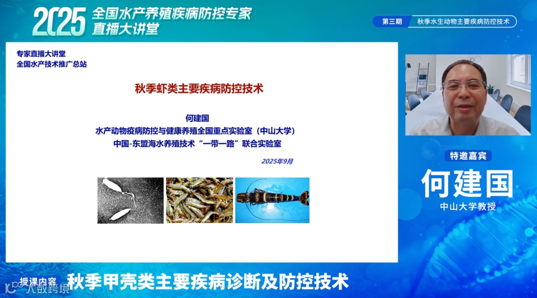 为科学指导秋季水产养殖病害防控,推动产业绿色高质量发展,9月18日,全国水产技术推广总站联合广东省动物疫病预防控制中心,线上举办2025年第三期全国水产养殖疾病防控专家直播大讲堂。