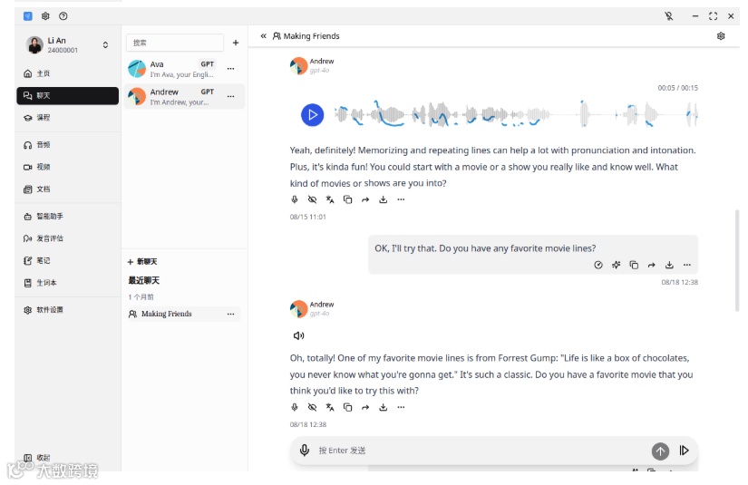 - 智能交互:集成聊天智能体与群聊功能,提升口语实战能力。