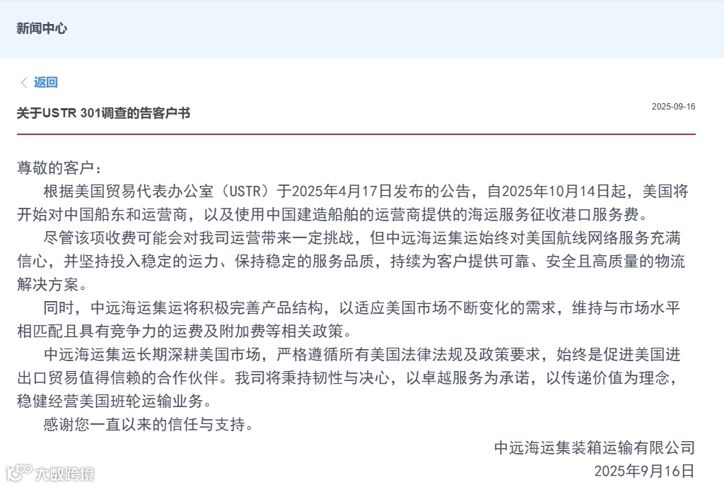 2025年9月16日,中远海运集运通过官网发布《关于USTR 301调查的告客户书》,就美国拟对中国船东及运营商征收港口服务费一事作出回应。