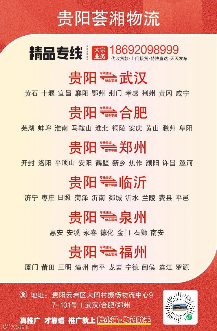 地址:贵阳云岩区大凹村振杨物流中心97-101号(武汉/合肥/郑州/临沂专线)