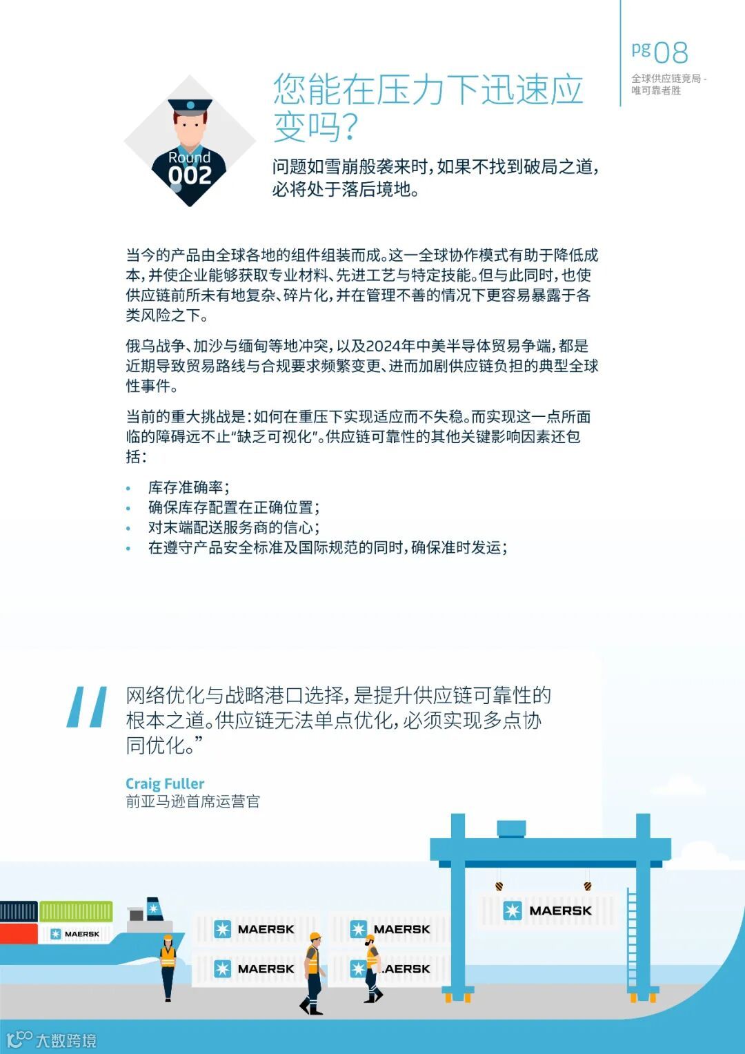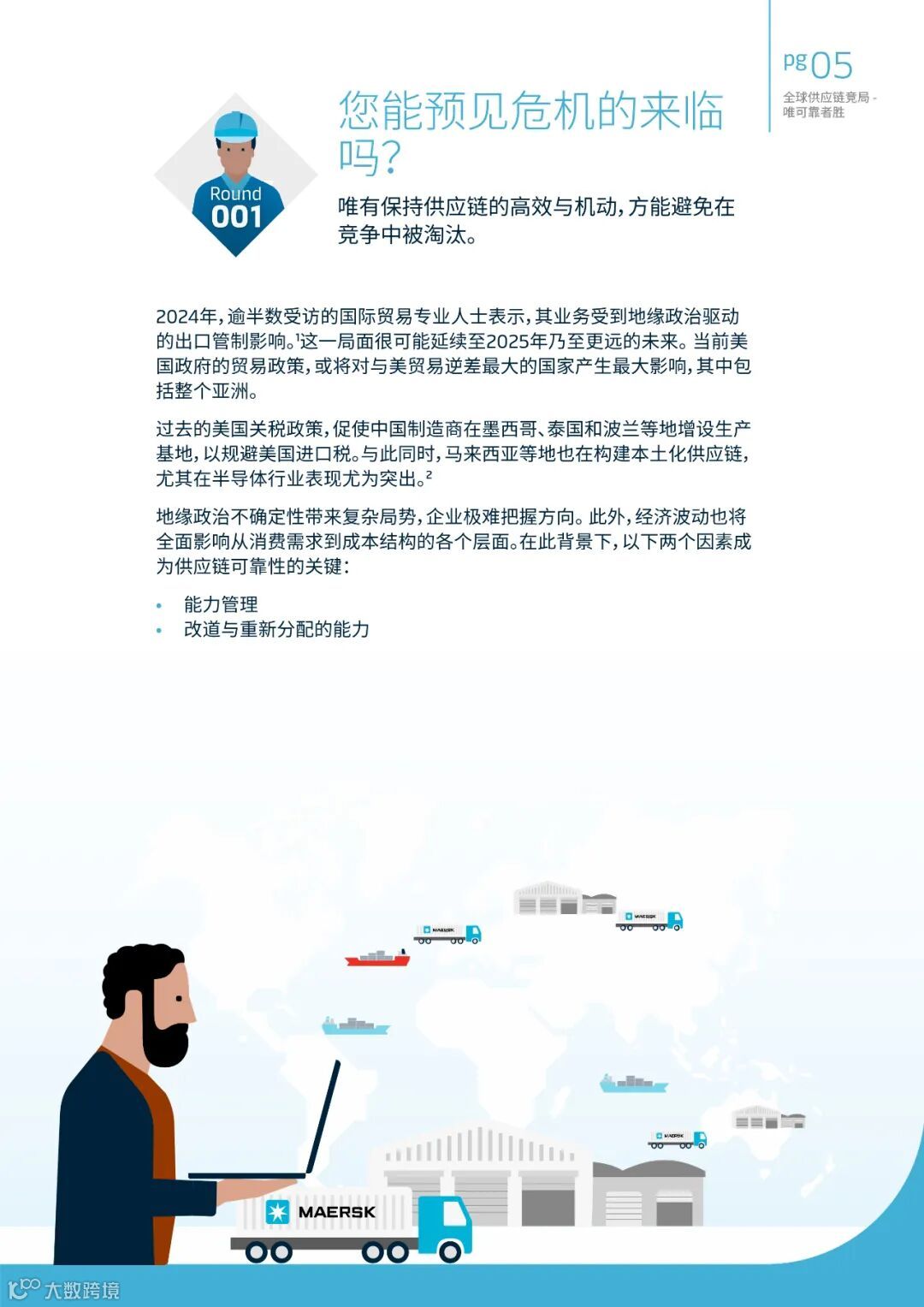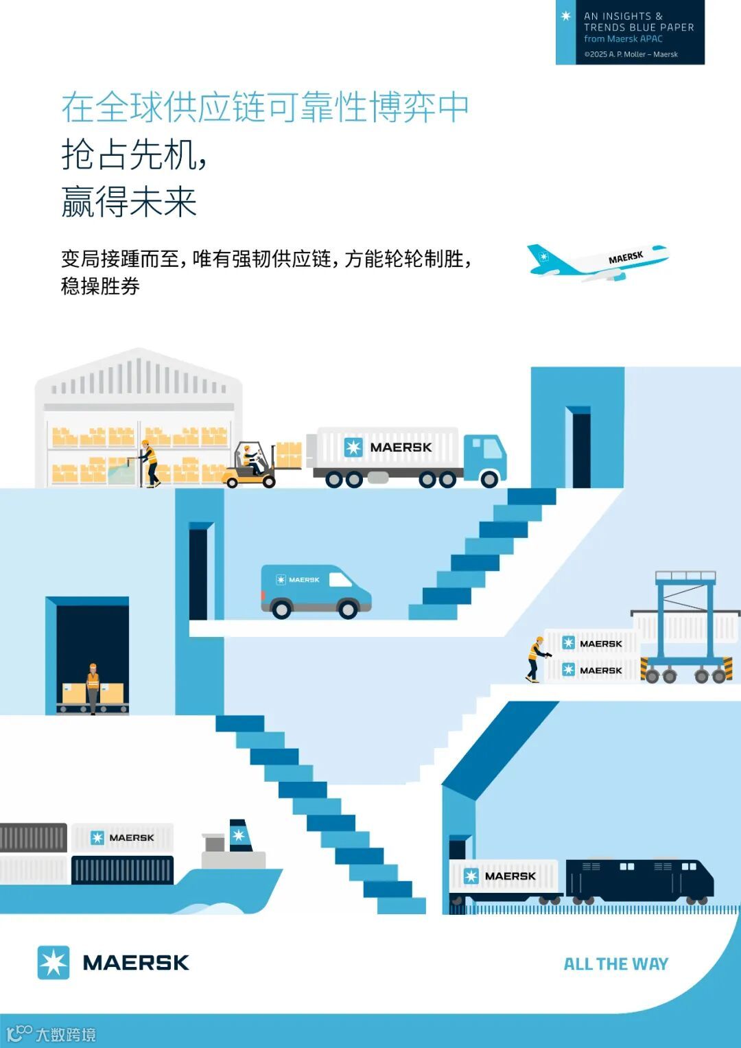 当前全球供应链正面临疫情以来最严峻的挑战。关税调整、地缘政治紧张及运营碎片化等因素导致物流延误频发、成本上升、复杂性加剧。马士基最新发布的《2025年在全球供应链可靠性博弈中抢占先机,赢得未来报告》以“供应链博弈”为框架,系统剖析了企业应对全球供应链波动的关键策略。