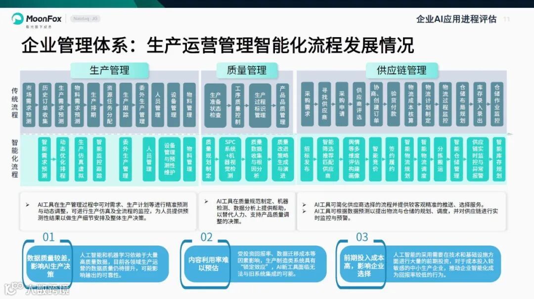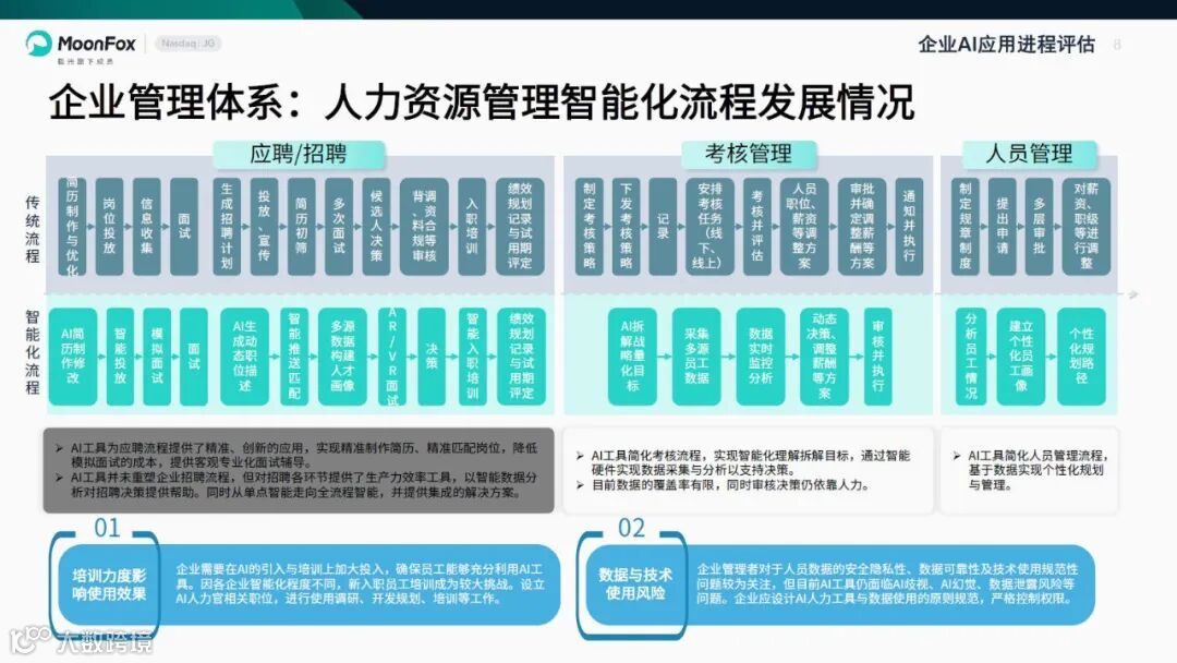 AI已广泛应用于人力资源、财务、研发、生产运营和市场营销等管理环节,有效提升效率并辅助决策,但也存在数据安全风险、系统集成难度高、创新应用不足等问题。