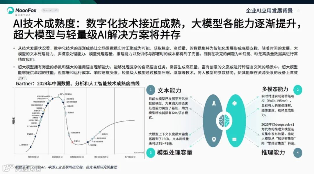 政策层面,2024至2025年多部门密集出台支持举措,涵盖“人工智能+”行动、标准体系建设与人才培养,为AI落地提供制度保障。技术上,数字化基础设施成熟推动全场景数据汇聚,大模型能力不断提升,但仍面临AI幻觉、高质量数据短缺等挑战。未来,超大模型与轻量级AI解决方案将并行发展。