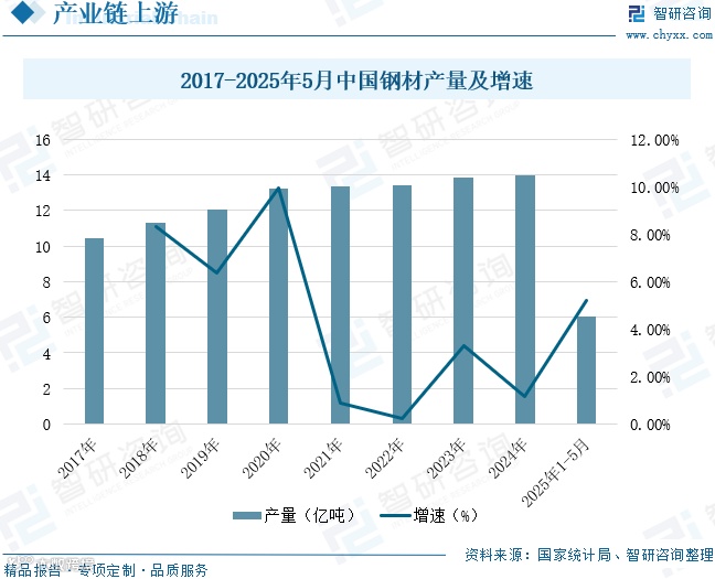 产业链上游主要包括钢材、铜材、合成树脂等原材料及生产设备供应。其中,钢材作为核心材料,直接影响轴承的硬度、耐磨性与承载能力。中国已成为全球最大的钢材生产国和消费国。国家统计局数据显示,2024年中国钢材产量达14亿吨,较2017年增长33.8%,年复合增长率4.25%。2025年1-5月产量为6.06亿吨,同比增长5.2%,为调心球轴承行业提供稳定原料支撑。