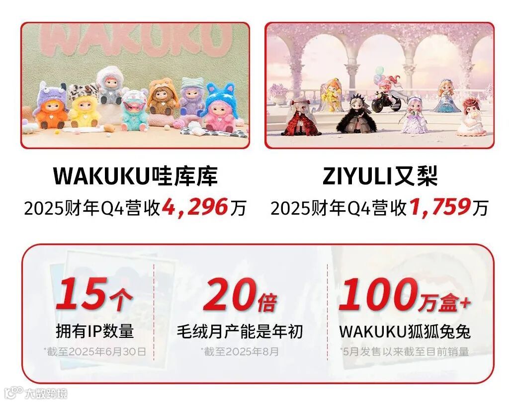 - Wakuku:2025财年第四季度实现营收4,296万元,其“狐狐兔兔捣蛋日记”二代毛绒产品自5月上市以来销量突破100万盒。