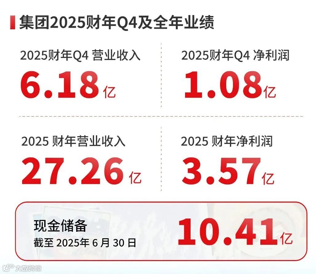 量子之歌(NASDAQ:QSG)近日发布2025财年第四季度及全年财报:全年营收27.26亿元,净利润3.57亿元;第四季度营收6.18亿元,净利润1.08亿元。公司在完成对潮玩企业深圳熠起文化有限公司(Letsvan)的全资收购后,首次披露潮玩业务收入达6,578万元,占总营收约10.6%。公司预计2026财年潮玩业务收入将达7.5亿至8亿元。