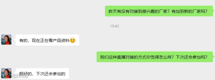 ▌直播中,两位主播联合推介各大品牌新品,多家厂商表示直播有效打通了推广渠道,精准触达潜在客户:“直播刚结束就有新好友申请。”即使未能实时观看的企业,也在社群中持续收到对接需求,验证了该模式的实际成效。