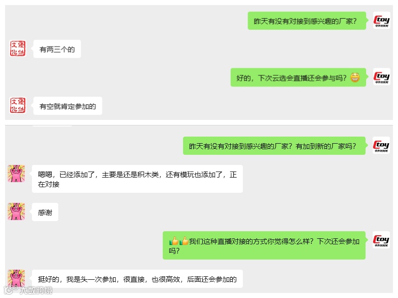 ▌通过“直播+社群对接+专题展示”三位一体模式,中外玩具网选品直播已成为玩具厂商高效对接的重要平台。本次直播吸引近300名优质买家加入选品对接群。采购商普遍认可该对接形式,认为直播有助于发现优质新供应商,展出新品兼具设计感与品质。多数买家表示将持续关注后续直播,期待与更多品牌建立深度合作。