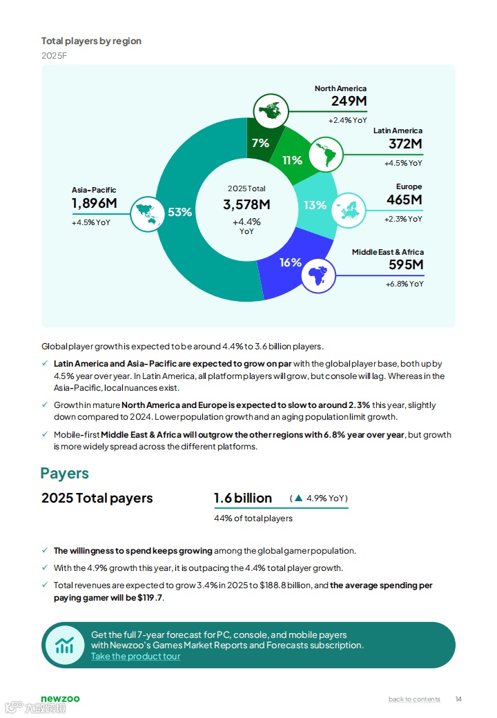 2025年全球游戏玩家预计达36亿,同比增长4.4%,占全球网民总数的61.5%,但占比趋于稳定;付费玩家达16亿,同比增长4.9%,增速高于总玩家数。全球游戏市场总收入约1888亿美元,同比增长3.4%,人均消费略有下降,显示市场增长更多依赖用户规模而非单用户支出提升。