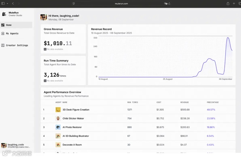 近期Nano Banana走红,有开发者迅速推出相关图像生成Agent,在MuleRun上架后三天内收入超千美元。这类案例表明,即便基于现有模型构建,只要解决用户“不想学习提示词”的痛点,即可实现高效转化。