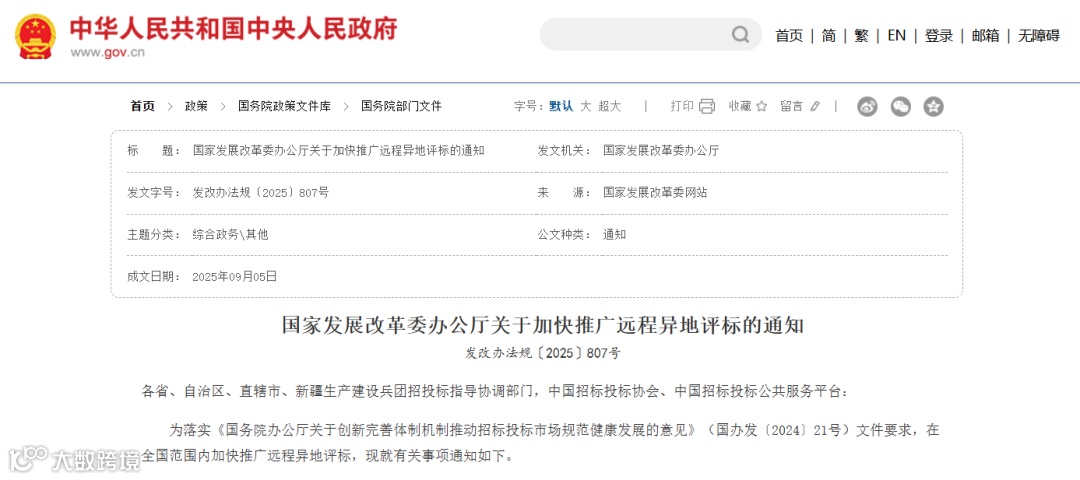 国家发展改革委办公厅近日发布《关于加快推广远程异地评标的通知》,要求在全国范围内加快推进远程异地评标工作,明确项目范围、建立专家库与评标场所共享目录、完善协同服务机制,推动招投标市场规范健康发展。
