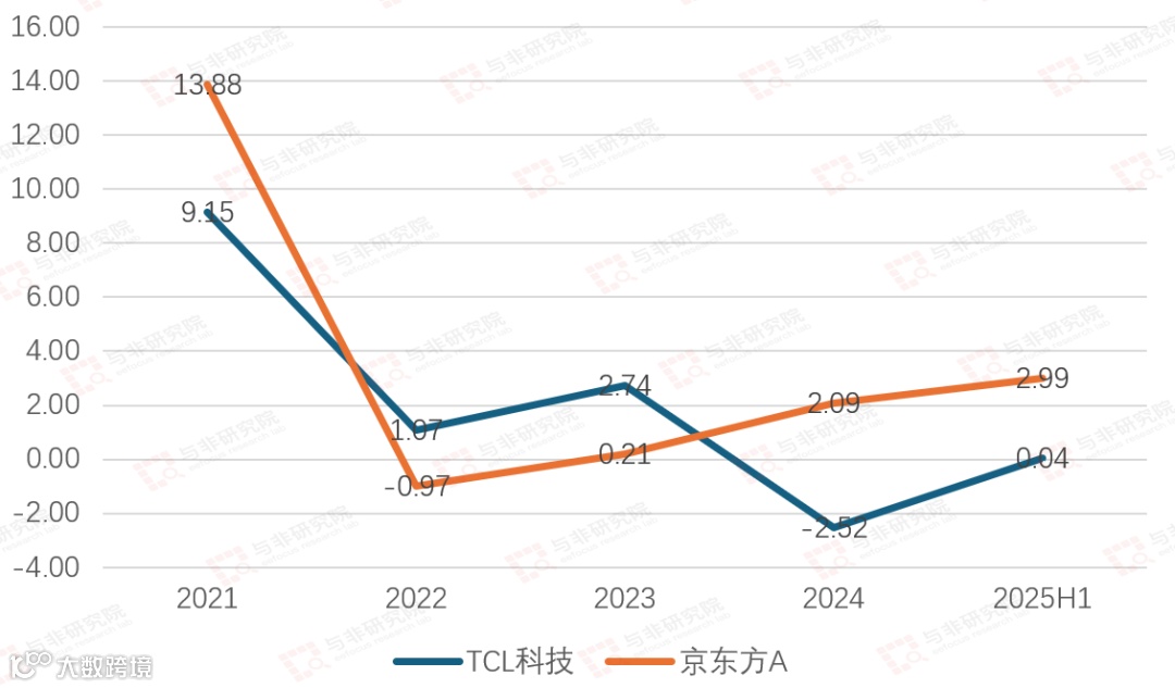 整体净利率方面,京东方表现更稳。2021–2025年上半年,其净利率由13.88%降至-0.97%后回升至2.99%;TCL科技则从9.15%下滑至2024年的-2.52%,2025年上半年仅回升至0.04%。
