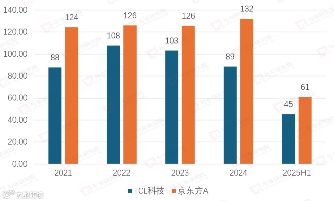 研发投入总额上,京东方持续领先。2021–2025年上半年分别为124亿、126亿、126亿、132亿、61亿元,总体稳定。TCL科技同期为88亿、108亿、103亿、89亿、45亿元,呈下降趋势。