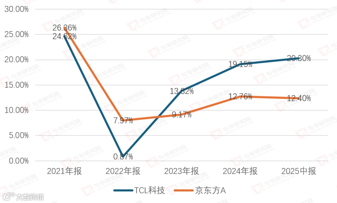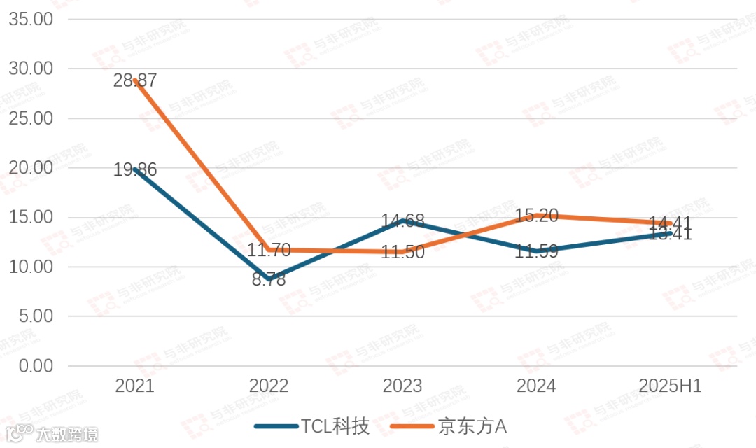 整体毛利率方面,2021–2022年京东方分别为28.87%、19.86%,优于TCL科技的19.86%、8.78%。2023年TCL科技以14.68%反超京东方的11.50%。2024年至2025年上半年,京东方分别为15.20%、14.41%,TCL科技为11.59%、13.41%,差距逐步缩小。