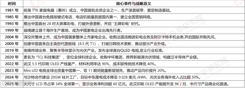 TCL创立于1981年,2019年完成资产重组,剥离终端业务后于2020年更名为“TCL科技集团股份有限公司”。目前公司已发展为涵盖半导体显示、新能源光伏等多领域的科技产业集团。