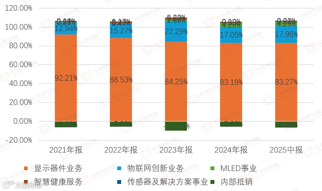 在半导体显示领域,TCL科技构建了“LCD守城(全球市占34%)、Mini LED突围(国内第一)、印刷OLED革命(全球唯一量产)”三级体系。电视面板市占率全球第二(24%),电竞显示器市占率全球第一(35%),车载显示销量同比增长61%。 主营业务包括半导体显示器件、电子分销、新能源光伏及硅材料等。2021–2024年,半导体显示业务收入由881亿元降至657亿元后回升至1043亿元,2025年上半年为576亿元;电子分销稳定在301–319亿元区间;新能源光伏及硅料业务从高点670亿元回落至2025年上半年的134亿元。