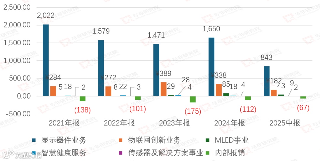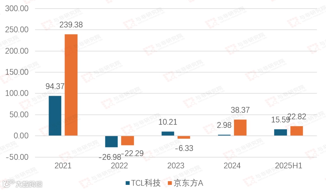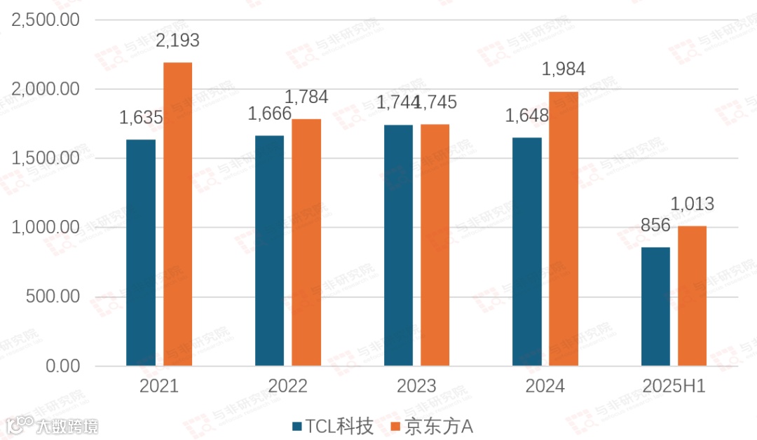 2021–2024年,京东方整体营收领先TCL科技。2023年两者差距不足1亿元,2024年京东方反超约300亿元。2025年上半年,京东方仍领先157亿元。