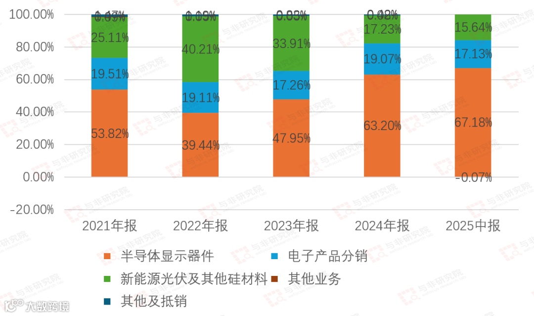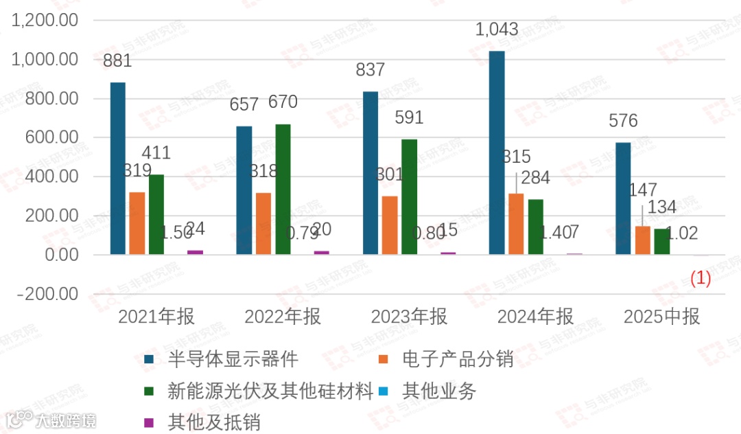 营收占比方面,半导体显示业务占比持续上升,从2021年的53.82%提升至2025年上半年的67.18%;新能源光伏及硅料业务占比由2021年的25.11%升至2022年40.21%后震荡下行至15.64%;电子分销维持在17%–19.5%之间,整体结构趋于聚焦。